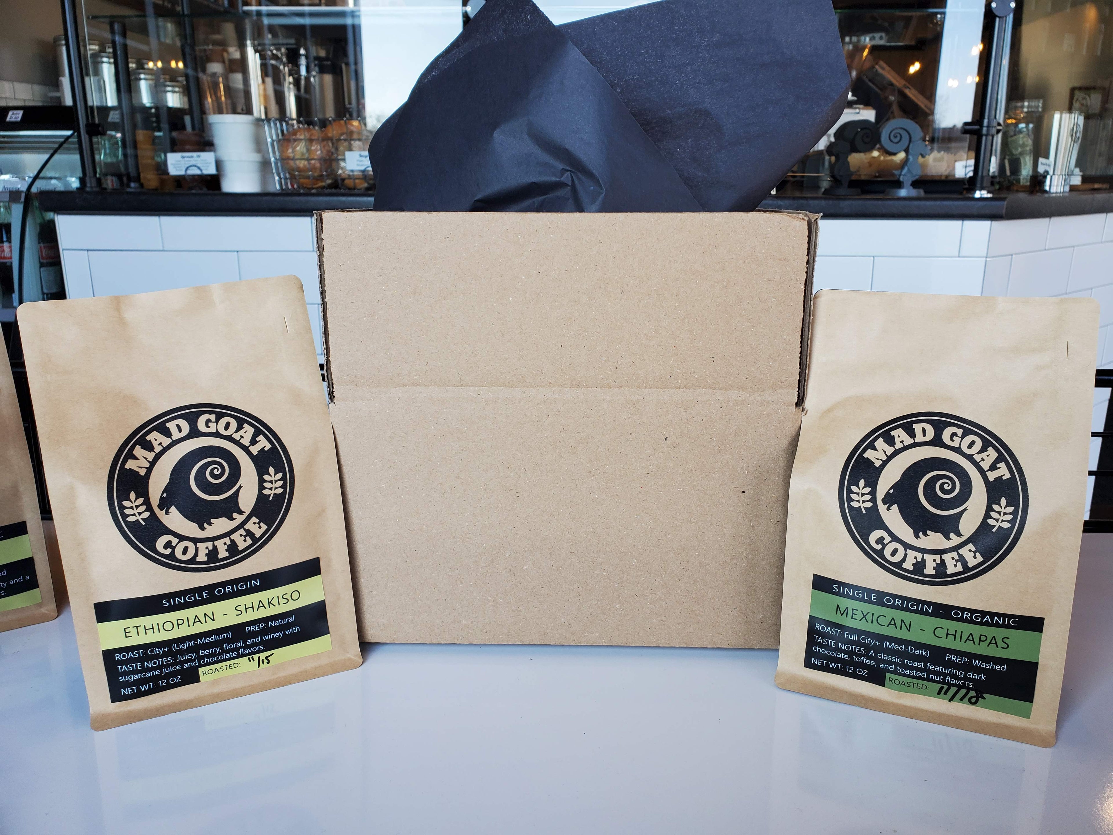 Order online, shipped to your home. Beans for home or office, gift cards good both online and in-store, and of course that sweet, sweet Mad Goat merch. 😁