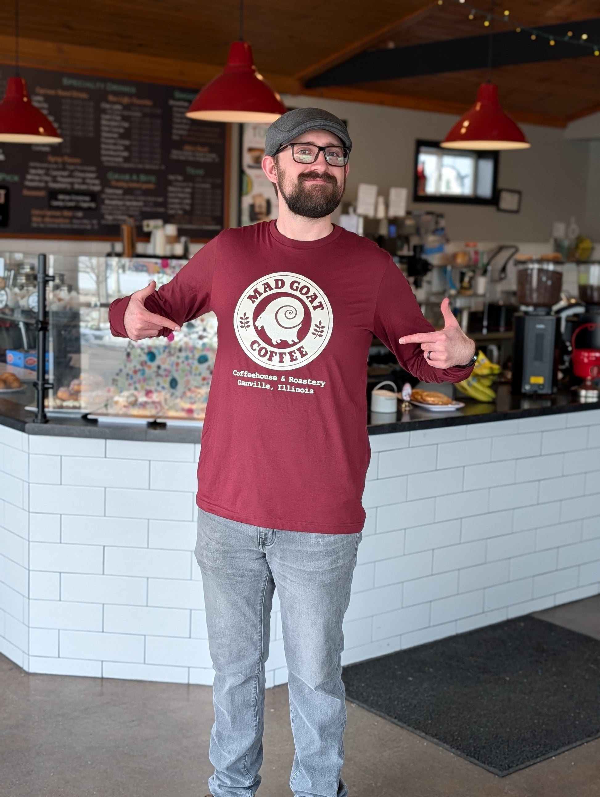 Soft Bella+Canvas long-sleeve in maroon with cream logo.